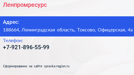 Ленпромресурс по адресу 188664, Ленинградская область, Токсово, Офицерская, 4а в дальнейшем Организация, размещена в следующих категориях: