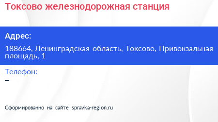 Токсово, железнодорожная станция по адресу 188664, Ленинградская область, Токсово, Привокзальная площадь, 1 в дальнейшем Организация, размещена в следующих категориях:
