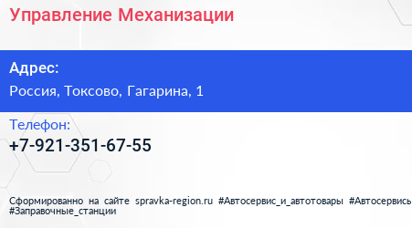 Управление Механизации по адресу улица Гагарина, СНТ «Пневматика», Токсовское городское поселение, Всеволожский район, Ленинградская область, Северо-Западный федеральный округ, 188664, Россия в дальнейшем Организация, размещена в следующих категориях:
