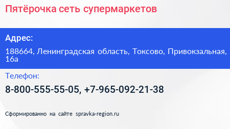 Пятёрочка, сеть супермаркетов по адресу 188664, Ленинградская область, Токсово, Привокзальная, 16а в дальнейшем Организация, размещена в следующих категориях: