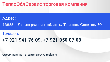 ТеплоОблСервис, торговая компания по адресу 188664, Ленинградская область, Токсово, Советов, 50г в дальнейшем Организация, размещена в следующих категориях: