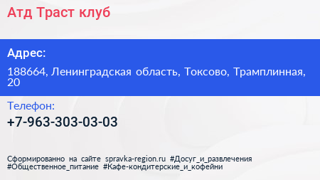 Атд Траст, клуб по адресу 188664, Ленинградская область, Токсово, Трамплинная, 20 в дальнейшем Организация, размещена в следующих категориях: