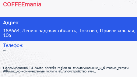 COFFEEmania по адресу 188664, Ленинградская область, Токсово, Привокзальная, 10а в дальнейшем Организация, размещена в следующих категориях: