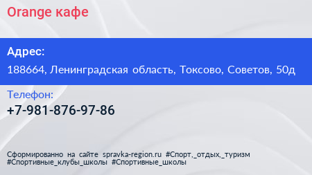 Orange, кафе по адресу 188664, Ленинградская область, Токсово, Советов, 50д в дальнейшем Организация, размещена в следующих категориях: