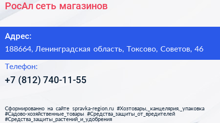 РосАл, сеть магазинов по адресу 188664, Ленинградская область, Токсово, Советов, 46 в дальнейшем Организация, размещена в следующих категориях: