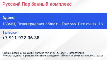 Русский Пар, банный комплекс по адресу 188664, Ленинградская область, Токсово, Разъезжая, 13 в дальнейшем Организация, размещена в следующих категориях: