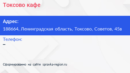 Токсово, кафе по адресу 188664, Ленинградская область, Токсово, Советов, 45в в дальнейшем Организация, размещена в следующих категориях: