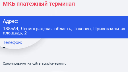 МКБ, платежный терминал по адресу 188664, Ленинградская область, Токсово, Привокзальная площадь, 2 в дальнейшем Организация, размещена в следующих категориях: