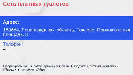 Сеть платных туалетов по адресу 188664, Ленинградская область, Токсово, Привокзальная площадь, 3 в дальнейшем Организация, размещена в следующих категориях: