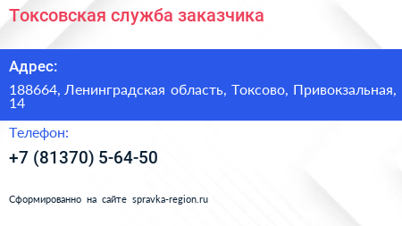 Токсовская служба заказчика по адресу 188664, Ленинградская область, Токсово, Привокзальная, 14 в дальнейшем Организация, размещена в следующих категориях:
