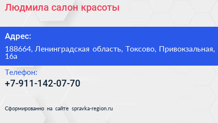Людмила, салон красоты по адресу 188664, Ленинградская область, Токсово, Привокзальная, 16а в дальнейшем Организация, размещена в следующих категориях: