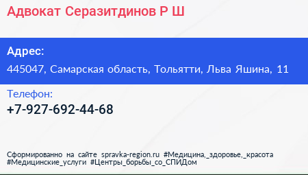 Адвокат Серазитдинов Р.Ш. по адресу 445047, Самарская область, Тольятти, Льва Яшина, 11 в дальнейшем Организация, размещена в следующих категориях: