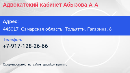 Адвокатский кабинет Абызова А.А. по адресу 445017, Самарская область, Тольятти, Гагарина, 6 в дальнейшем Организация, размещена в следующих категориях: