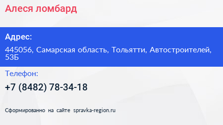 Алеся, ломбард по адресу 445056, Самарская область, Тольятти, Автостроителей, 53Б в дальнейшем Организация, размещена в следующих категориях: