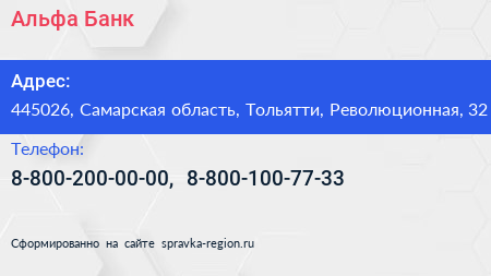 Альфа-Банк по адресу 445026, Самарская область, Тольятти, Революционная, 32 в дальнейшем Организация, размещена в следующих категориях: