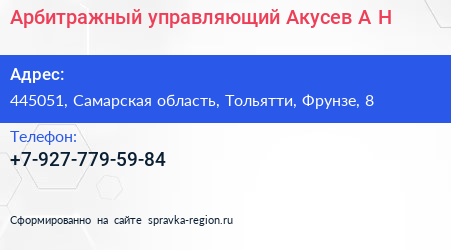 Арбитражный управляющий Акусев А.Н. по адресу 445051, Самарская область, Тольятти, Фрунзе, 8 в дальнейшем Организация, размещена в следующих категориях: