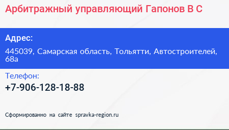 Арбитражный управляющий Гапонов В.С. по адресу 445039, Самарская область, Тольятти, Автостроителей, 68а в дальнейшем Организация, размещена в следующих категориях: