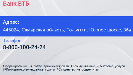 Банк ВТБ по адресу 445024, Самарская область, Тольятти, Южное шоссе, 36а в дальнейшем Организация, размещена в следующих категориях: