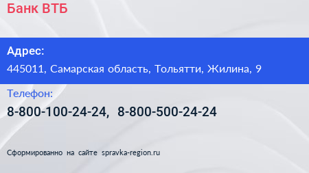 Банк ВТБ по адресу 445011, Самарская область, Тольятти, Жилина, 9 в дальнейшем Организация, размещена в следующих категориях: