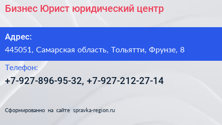 Бизнес-Юрист, юридический центр по адресу 445051, Самарская область, Тольятти, Фрунзе, 8 в дальнейшем Организация, размещена в следующих категориях: