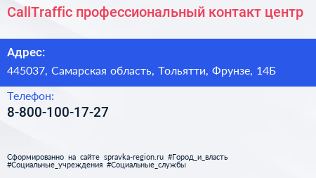 CallTraffic, профессиональный контакт-центр по адресу 445037, Самарская область, Тольятти, Фрунзе, 14Б в дальнейшем Организация, размещена в следующих категориях: