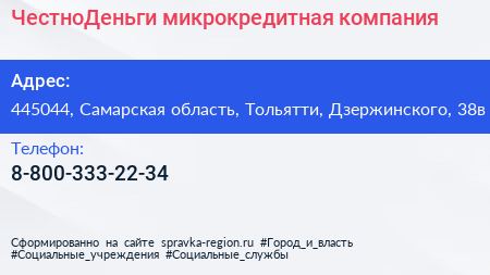 ЧестноДеньги, микрокредитная компания по адресу 445044, Самарская область, Тольятти, Дзержинского, 38в в дальнейшем Организация, размещена в следующих категориях: