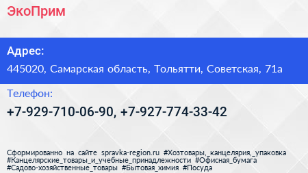 ЭкоПрим по адресу 445020, Самарская область, Тольятти, Советская, 71а в дальнейшем Организация, размещена в следующих категориях: