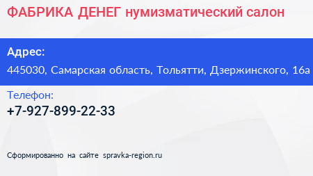 ФАБРИКА ДЕНЕГ, нумизматический салон по адресу 445030, Самарская область, Тольятти, Дзержинского, 16а в дальнейшем Организация, размещена в следующих категориях: