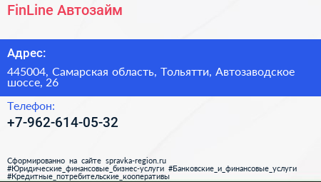 FinLine-Автозайм по адресу 445004, Самарская область, Тольятти, Автозаводское шоссе, 26 в дальнейшем Организация, размещена в следующих категориях: