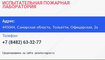 ИСПЫТАТЕЛЬНАЯ ПОЖАРНАЯ ЛАБОРАТОРИЯ по адресу 445044, Самарская область, Тольятти, Офицерская, 2а в дальнейшем Организация, размещена в следующих категориях:
