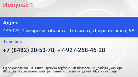 Импульс 1 по адресу 445024, Самарская область, Тольятти, Дзержинского, 98 в дальнейшем Организация, размещена в следующих категориях: