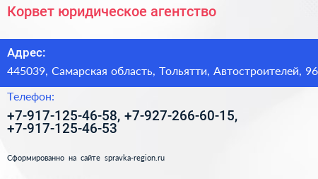 Корвет, юридическое агентство по адресу 445039, Самарская область, Тольятти, Автостроителей, 96 в дальнейшем Организация, размещена в следующих категориях: