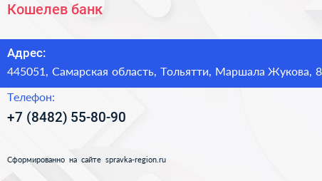 Кошелев-банк по адресу 445051, Самарская область, Тольятти, Маршала Жукова, 8 в дальнейшем Организация, размещена в следующих категориях: