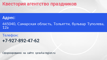 Квестория, агентство праздников по адресу 445040, Самарская область, Тольятти, бульвар Туполева, 12а в дальнейшем Организация, размещена в следующих категориях: