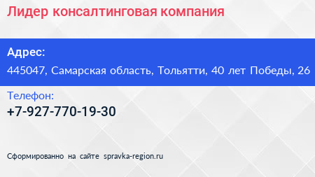 Лидер, консалтинговая компания по адресу 445047, Самарская область, Тольятти, 40 лет Победы, 26 в дальнейшем Организация, размещена в следующих категориях: