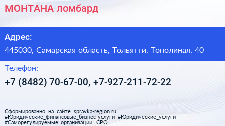 МОНТАНА, ломбард по адресу 445030, Самарская область, Тольятти, Тополиная, 40 в дальнейшем Организация, размещена в следующих категориях: