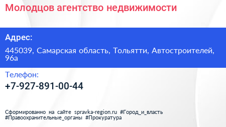 Молодцов, агентство недвижимости по адресу 445039, Самарская область, Тольятти, Автостроителей, 96а в дальнейшем Организация, размещена в следующих категориях: