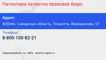 Патентиум, патентно-правовое бюро по адресу 445044, Самарская область, Тольятти, Ворошилова, 17 в дальнейшем Организация, размещена в следующих категориях: