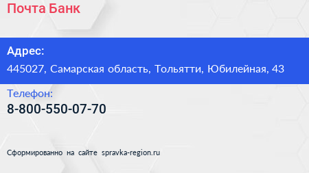 Почта Банк по адресу 445027, Самарская область, Тольятти, Юбилейная, 43 в дальнейшем Организация, размещена в следующих категориях: