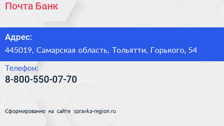 Почта Банк по адресу 445019, Самарская область, Тольятти, Горького, 54 в дальнейшем Организация, размещена в следующих категориях: