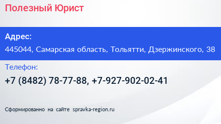 Полезный Юрист по адресу 445044, Самарская область, Тольятти, Дзержинского, 38 в дальнейшем Организация, размещена в следующих категориях: