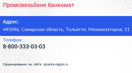 Промсвязьбанк, банкомат по адресу 445046, Самарская область, Тольятти, Механизаторов, 11 в дальнейшем Организация, размещена в следующих категориях: