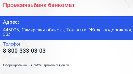 Промсвязьбанк, банкомат по адресу 445005, Самарская область, Тольятти, Железнодорожная, 33а в дальнейшем Организация, размещена в следующих категориях: