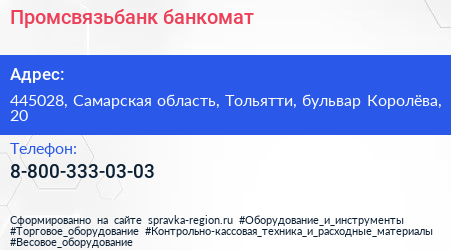 Промсвязьбанк, банкомат по адресу 445028, Самарская область, Тольятти, бульвар Королёва, 20 в дальнейшем Организация, размещена в следующих категориях: