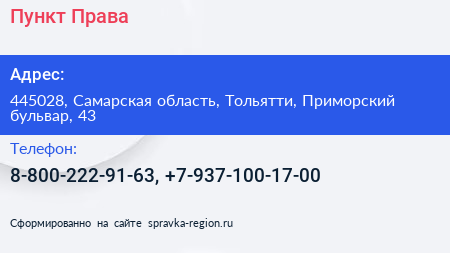 Пункт Права по адресу 445028, Самарская область, Тольятти, Приморский бульвар, 43 в дальнейшем Организация, размещена в следующих категориях: