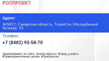 РОСПРОЕКТ по адресу 445017, Самарская область, Тольятти, Молодёжный бульвар, 13 в дальнейшем Организация, размещена в следующих категориях: