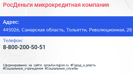 РосДеньги, микрокредитная компания по адресу 445026, Самарская область, Тольятти, Революционная, 28 в дальнейшем Организация, размещена в следующих категориях: