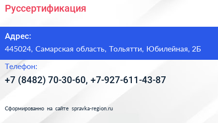 Руссертификация по адресу 445024, Самарская область, Тольятти, Юбилейная, 2Б в дальнейшем Организация, размещена в следующих категориях: