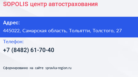 SOPOLIS, центр автострахования по адресу 445022, Самарская область, Тольятти, Толстого, 27 в дальнейшем Организация, размещена в следующих категориях: