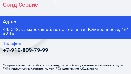 Сэлд Сервис по адресу 445043, Самарская область, Тольятти, Южное шоссе, 161 к2.1а в дальнейшем Организация, размещена в следующих категориях: